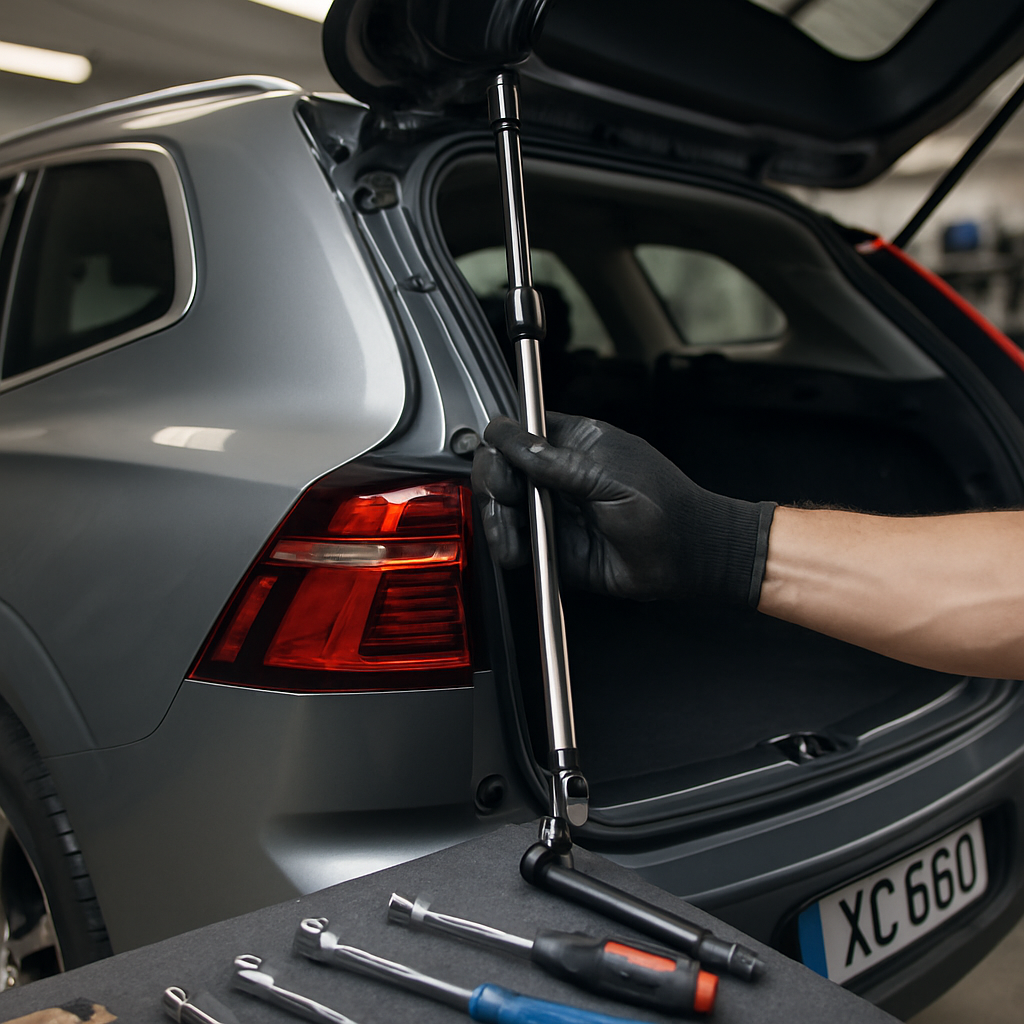 Parkera bilen på ett plant underlag och säkra att dörrmekanismen inte kan falla oväntat. Om din XC60 har elektrisk baklucka, koppla ur batteriet före arbetet för att undvika oavsiktlig aktivering.