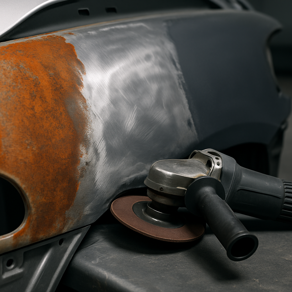 Processen på en verkstad inkluderar maskinell borttagning av rost med sandblåster eller rotationsslipar, applicering av epoxi- eller zinkbaserade grundfärger som ger överlägset korrosionsskydd, och flerskikts lackering i klimatkontrollerad miljö. För genomrostade delar använder verkstäder MIG/MAG-svetsning för att sätta in nya plåtbitar.