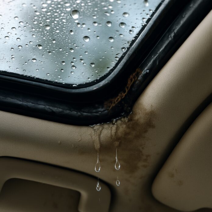 Dräneringsrören sitter vanligtvis i varje hörn av taket och leder ner genom stolparna till bilens undersida. Med tiden kan dessa rör bli igentäppta av organiskt material eller helt enkelt börja spricka på grund av ålder och temperaturväxlingar. När systemet inte fungerar samlas vatten i takramen och söker sig in genom de minsta springor det kan hitta.