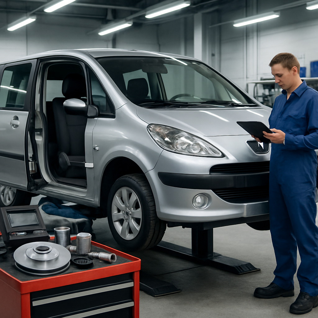 Kontrollera reservdelar som bromsbelägg, oljefilter och luftfilter vid varje service. Byt kuggrem enligt schema, typiskt vid 100 000 kilometer för att undvika motorskador. Detta är kritiskt eftersom Peugeot-motorer är interferensmotorer där ventiler och kolvar kolliderar vid rembrott.