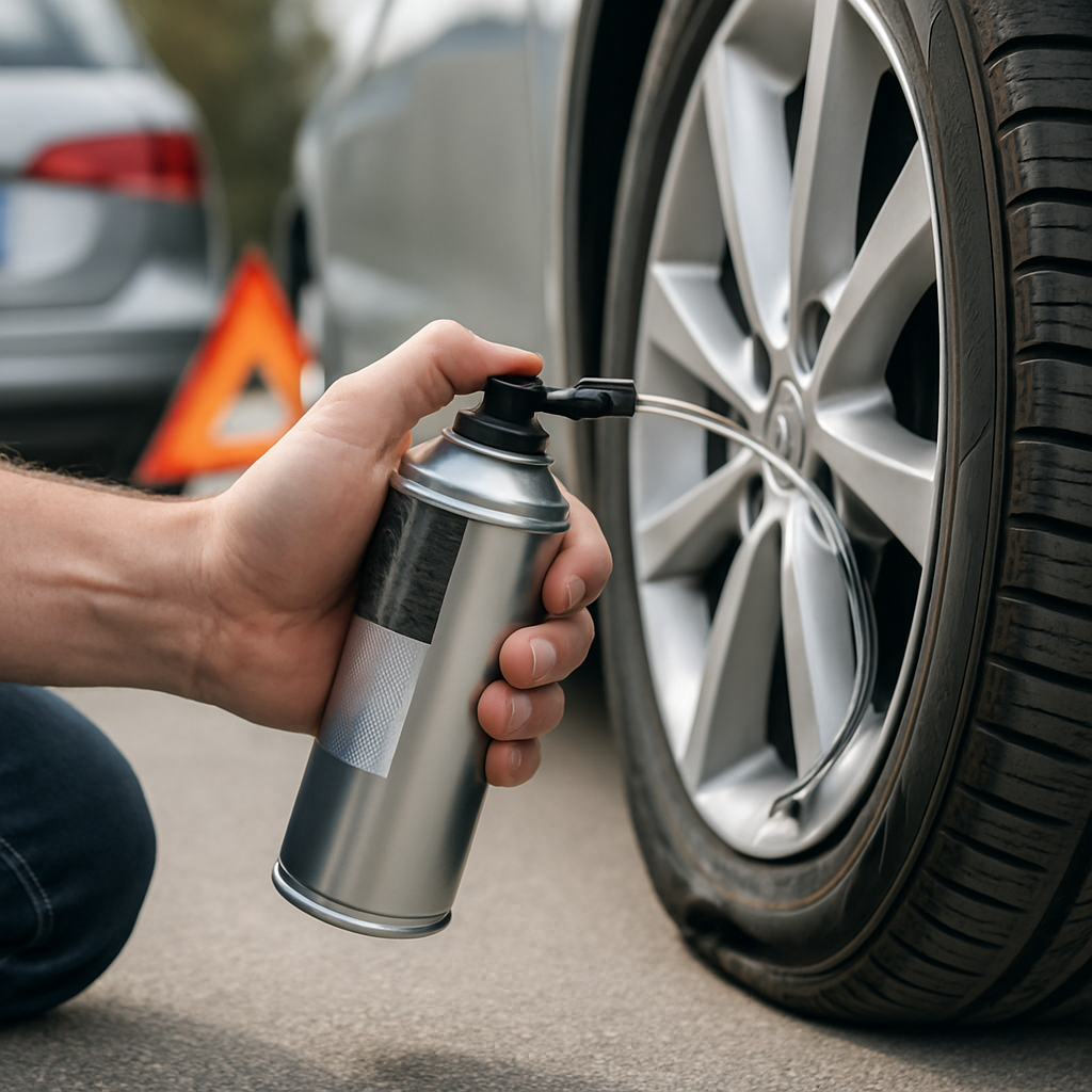 Förvara punkteringssprayen i en sval och torr plats i bilen, helst i bagageutrymmet. Undvik att lämna den i direkt solljus eller i extremt varma eller kalla miljöer. Höga temperaturer kan öka trycket i burken och påskynda nedbrytningen av tätningsmedlet.