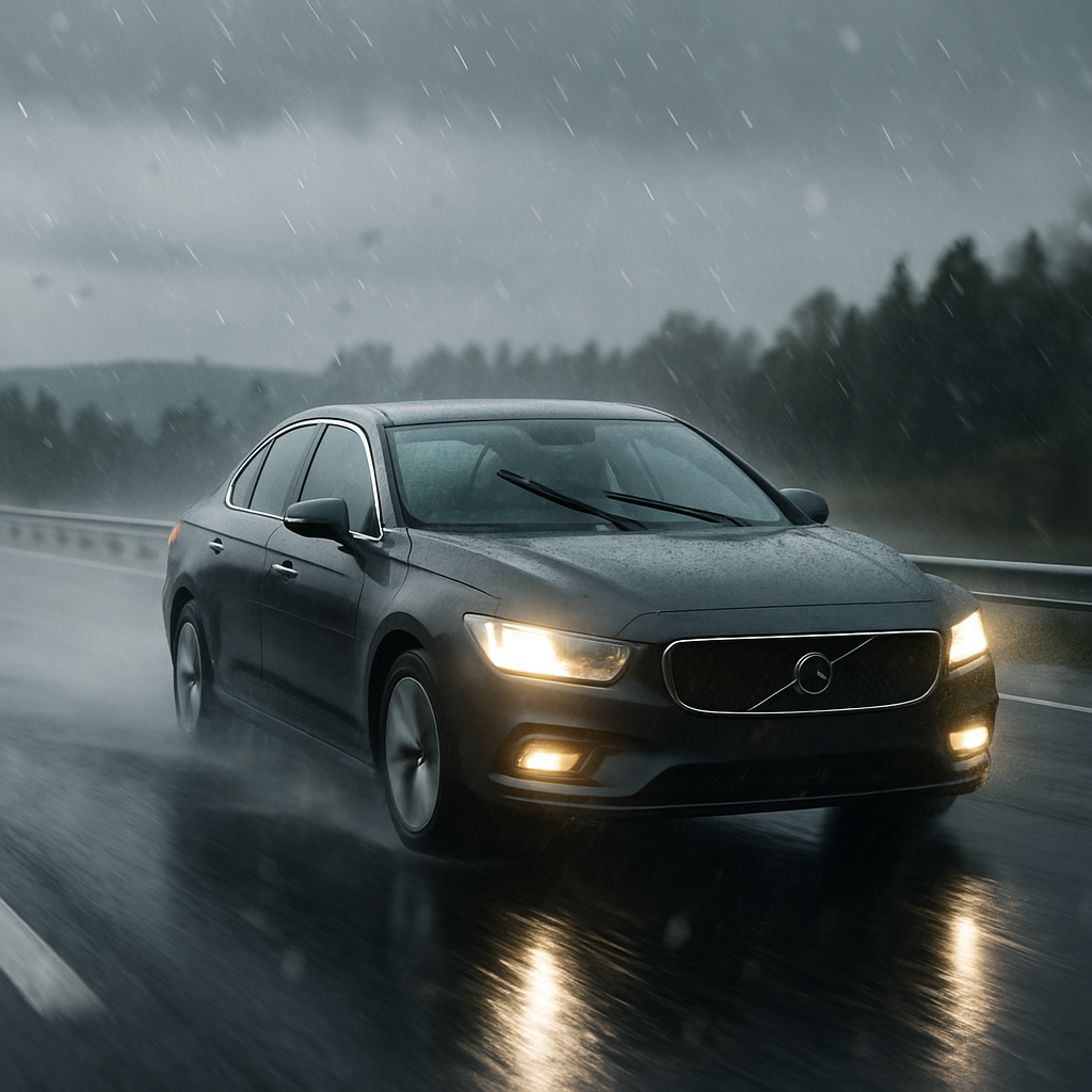 Reducera din normala hastighet med 20-30% på våta vägar. På motorväg innebär det att sänka från 110 km/h till max 80 km/h vid kraftigt regn. Vattenfilm på vägen kan skapa aqvaplaning även vid måttliga hastigheter. Tänk på att moderna däck med bra mönster leder bort upp till 25 liter vatten per sekund vid 80 km/h – överstiger du den hastigheten ökar risken exponentiellt.